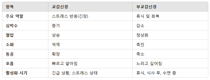 교감신경과 부교감신경은 서로 상반된 역할을 하면서도 상호 보완적으로 작용하여 몸의 항상성을 유지합니다.